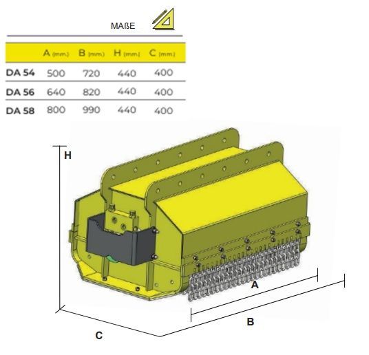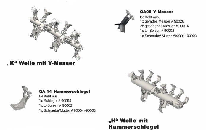 Die Messer sind Y-förmig und ein anderer in der Mitte, um Büsche mit Durchmesser bis 6cm abzu-schneiden. Möglichkeit Hammerrotor (außer DA 5x) und einer direkter Aufnahme mit Bolzen oder eines Sattels für SWE.