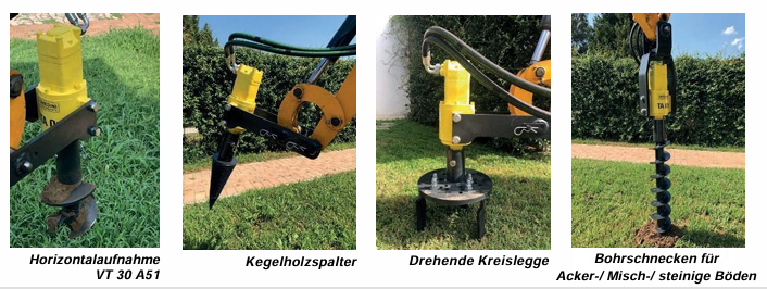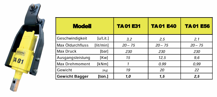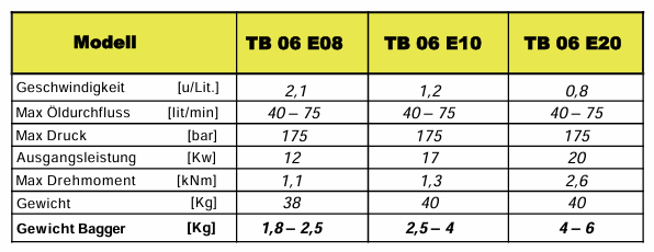 Unsere Erdbohrer Serie TA und TB sind geeignet für den Einsatz an Minibagger mit Gewicht von 1 bis 6 Tonnen.