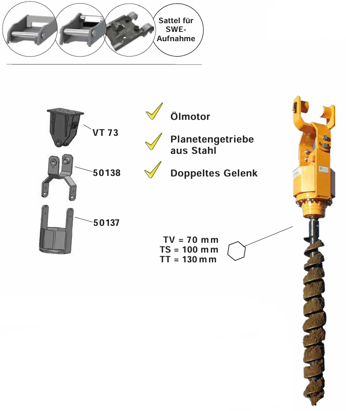 Unsere Erdbohrer Serien TV-TS-TT sind mit einer breiten Palette von Bohrschnecken ausgestattet, die in verschiedenen Durchmesser und Längen verfügbar sind und für jede Bodenart (Ackerboden, gemischt, steinig) geeignet sind.