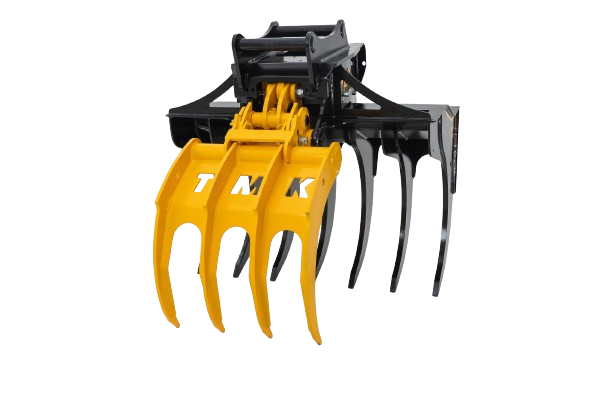 Der TMK MultiGrab ist ein stabiles und langlebiges Multifunktionswerkzeug, das ursprünglich für Bagger entwickelt wurde. Heute hat es seinen Weg neben Baggern auch zu anderen Maschinen wie z. B. Ladern und Teleskopladern gefunden. Dank des genialen Designs und der effizienten optionalen Zusatzanbaugeräte des TMK MultiGrab ist es möglich, mehrere andere Anbaugeräte zu ersetzen. Der TMK MultiGrab besteht aus zwei Hauptteilen: einem stabilen Rahmen und einem – wie für TMK typisch – gelben Greifer, der gut sichtbar ist.