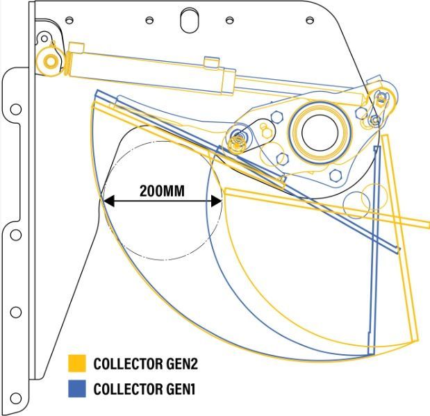Durch die geometrischen Verbesserungen wird der Sammler jetzt mit einer tieferen Bewegung geöffnet. Dadurch wird er auch bei größeren Durchmessern und verzweigten Bäumen effizienter, was die Sammelfähigkeiten verbessert.