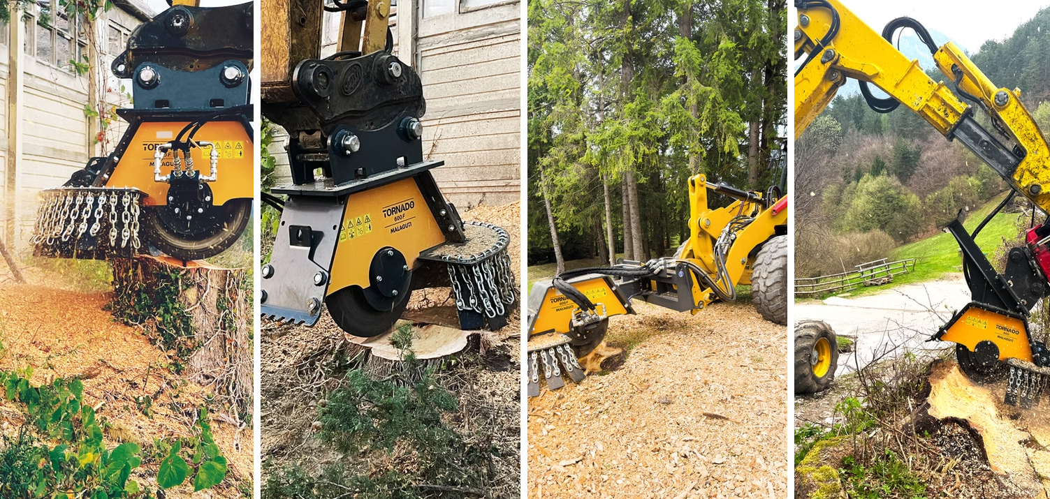 Die Malaguti Wurzelstockfräse für Bagger und Frontend-Maschinen ist ideal zum Fräsen von Stubben auch an schwierigen und schwer zugänglichen Hängen.