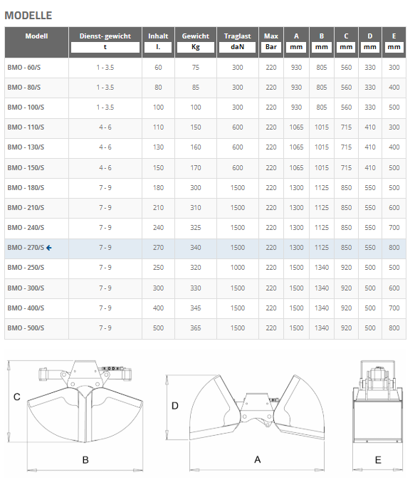 Die Zweischalengreifer der Serie BMO/S verfügen über einen Hydraulikzylinder mit großer Bohrung und eine konstruktive Geometrie, durch die sie sich nicht nur zum Laden, sondern auch für leichte Grabarbeiten eignen. Durch ihre kompakte Form sind sie das ideale Gerät für Lkw-Kräne. Die kleineren Modelle sind für den Einsatz an Minibaggern ab 1,5 t ausgelegt.